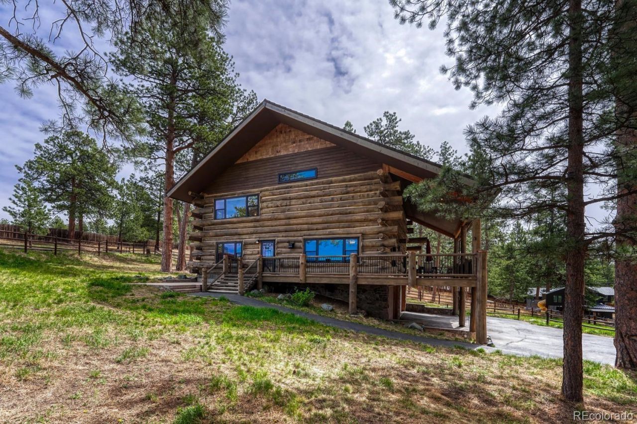 Custom log home in sought-after Indian Hills community with sweeping views of the Continental Divide. Set on a rare .85 acre level lot surrounded by the foothills that Denver buyers seek. Crafted from hand-peeled logs sourced from Steamboat Springs averaging 16 in diameter, this 4BR/4BA/4-car garage home pairs authentic mountain character with extensive upgrades completed over the past five years. EXTERIOR: Newly stained logs with completed caulking and chinking (2023), new gutters, Pella Impervia fiberglass windows and entry and storm doors, custom French doors from the dining room and primary suite. 50-year stone-coated steel roof with workmanship warranty (2024). Expansive wraparound deck sanded and stained (2022), fully fenced lot with motorized security gate, outdoor gas firepit, and patio pre-wired for hot tub. KITCHEN: Center island, walk-in pantry, custom tile backsplash, open flow to dining and living spaces, and a kitchen with a view. Updated with Miele dishwasher, induction oven, and new microwave. DINING/LIVING: Vaulted spaces anchored by log construction with fireplace that can supplement heat. PRIMARY SUITE: Main floor bedroom with private deck access with updated bath featuring new tile, cabinetry, and custom shower details. Convenient main floor laundry. SECONDARY BD/BAs: Two additional bedrooms upstairs with remodeled baths. LOFT: Flexible upper space ideal for office or workout area with some of the best views in the home. BASEMENT: Bedroom with upgraded ¾ bath offering additional living space. HVAC: 98% efficient furnace, heat pump as primary heat source with gas backup, integrated steam humidifier, UV air filtration, A/C, and Honeywell smart thermostat (2022/2023). Tankless hot water system. HOME EXTRAS: Hardwood flooring, hypoallergenic carpet, California Closet systems, automated blinds, radon mitigation, whole-home generator hookup, 220 EV-ready garage, 4-car garage with quiet smart openers (2022). Unincorporated for lower taxes and NO HOA.