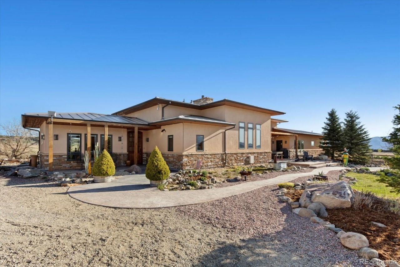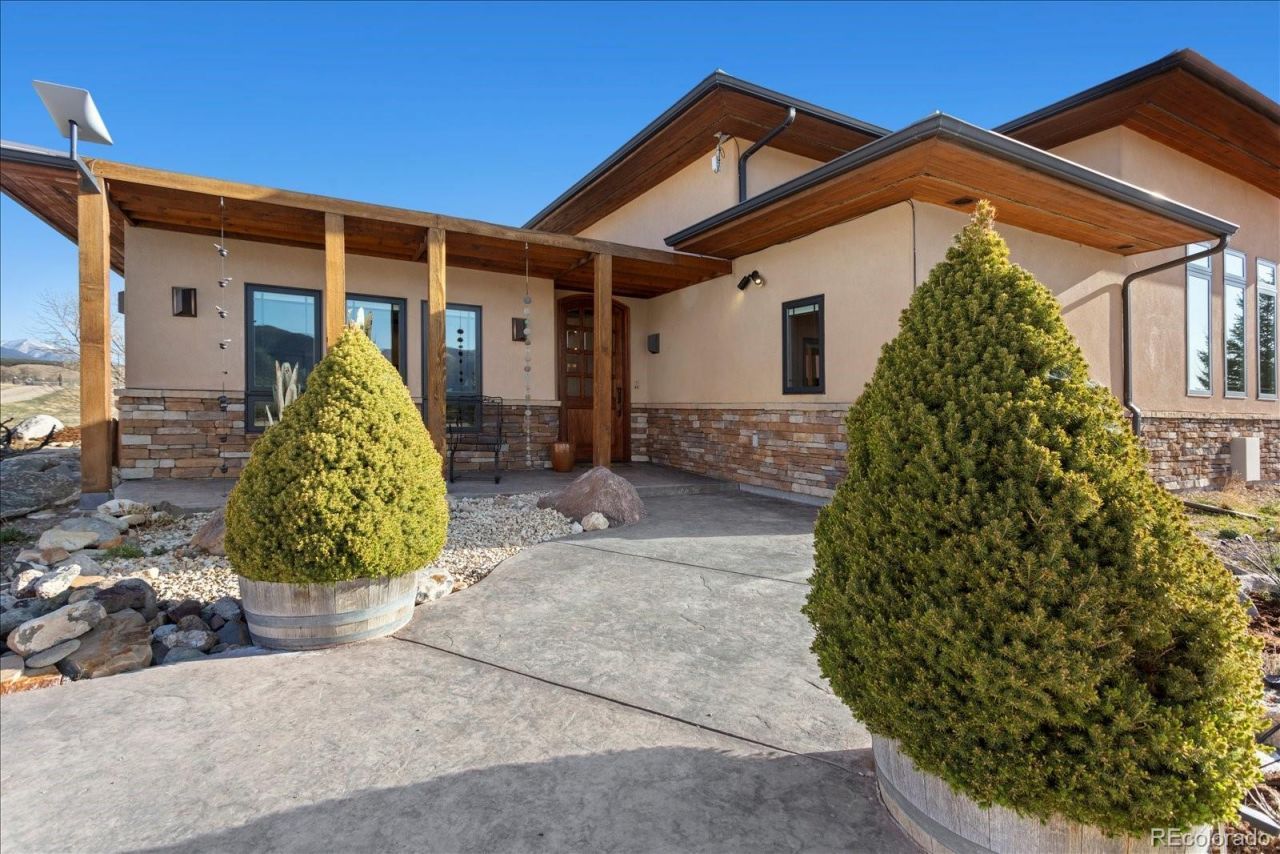 A striking architectural statement with true WOW factor, this custom-built horse property by Judd Fine Homes offers a rare level of design precision and craftsmanship, set against breathtaking Collegiate Peaks views on 9.9 fully irrigated acres in Salida. Enjoy no HOA, full perimeter fencing, and a private setting set back from the highway with minimal to no road noise.The open floor plan features exposed cedar beams, abundant natural light, and durable stained concrete floors. The great room is anchored by a striking stone fireplace and flows seamlessly into the dining area and kitchen with butlers pantry, ample cabinetry, and a spacious utility room with access to a heated loft for additional storage.Custom details shine throughout, including handcrafted Dutch doors, artisan-forged hardware, and high-performance Pella triple-pane windows that perfectly frame the surrounding mountain views. Step outside to enjoy the newly designed concrete patio, designated pad ready for a hot tub, professionally landscaped yard, and a private fenced backyard ideal for relaxing, entertaining, or taking in the surrounding views and pasture.The primary suite features a tray ceiling, walk-in closet with in-suite laundry, and a spa-like bath with a custom tiled shower.Designed for efficiency and comfort with three on-demand hot water heaters and an integrated solar system.The detached garage and guest quarters features in-floor radiant heat throughout and includes an oversized two-car garage, a heated bunk room with full bath, an office or bonus room with an electric fireplace, and a spacious storage area.Equestrian-ready with loafing shed, corral with automatic waterer, hay storage, and 9.9 irrigated acres supported by one full share of Missouri Park Ditch water with flood and sprinkler irrigation.A quaint greenhouse enhances the propertys appeal. This is a rare opportunity to own a truly exceptional property?one that must be seen in person to be fully appreciated.